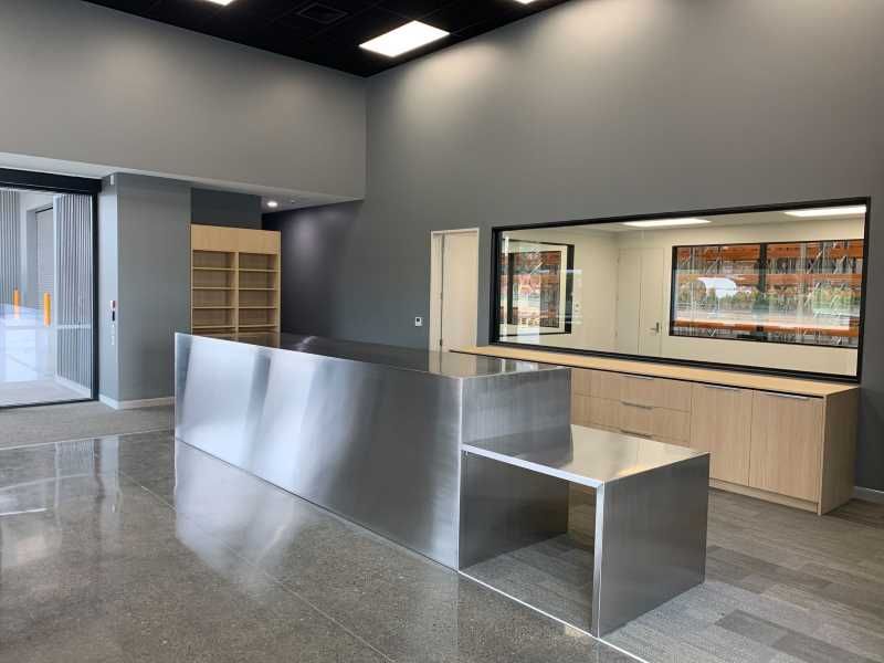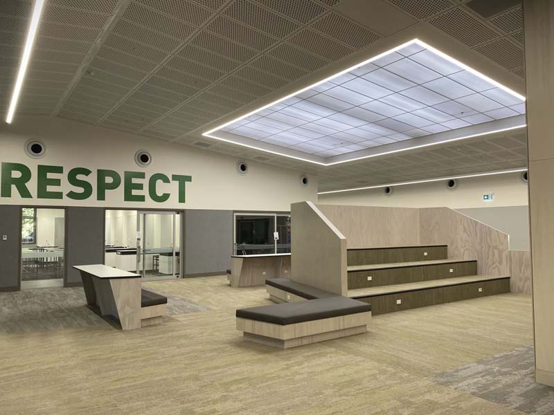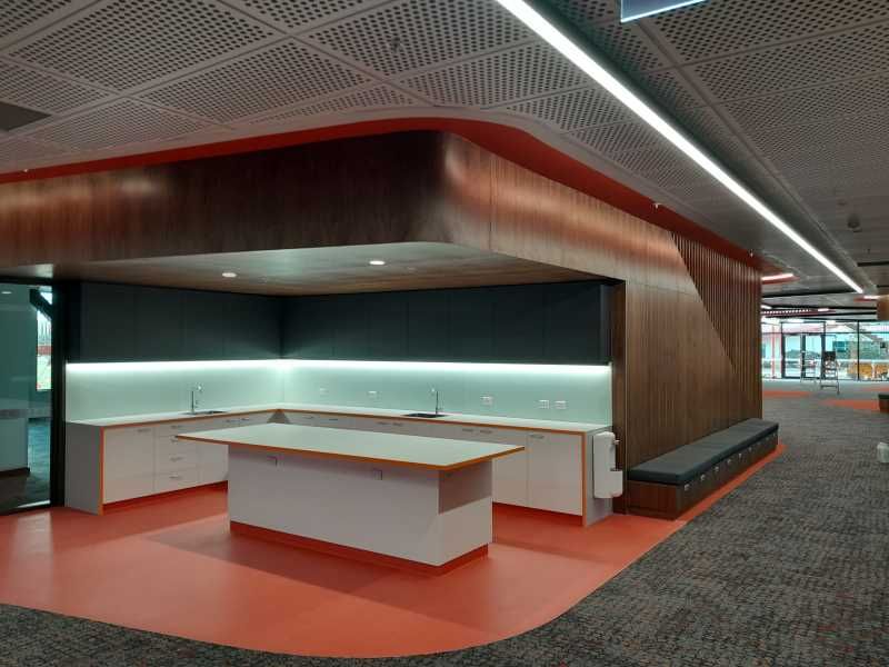 Suspended Decortech perforated timber tile and grid ceilings.